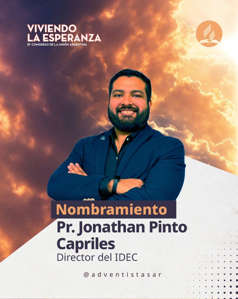 El Pr. Jonathan Pinto Capriles, asumió la dirección del Instituto de Desarrollo del Estudiante Colportor (IDEC) de la Universidad Adventista del Plata (UAP), reemplazando al Pr. Nélson Quezada, quien fue llamado a desempeñarse como departamental del Ministerio de Publicaciones, Espíritu de Profecía y Salud, en la Asociación Bonaerense de la Iglesia Adventista.