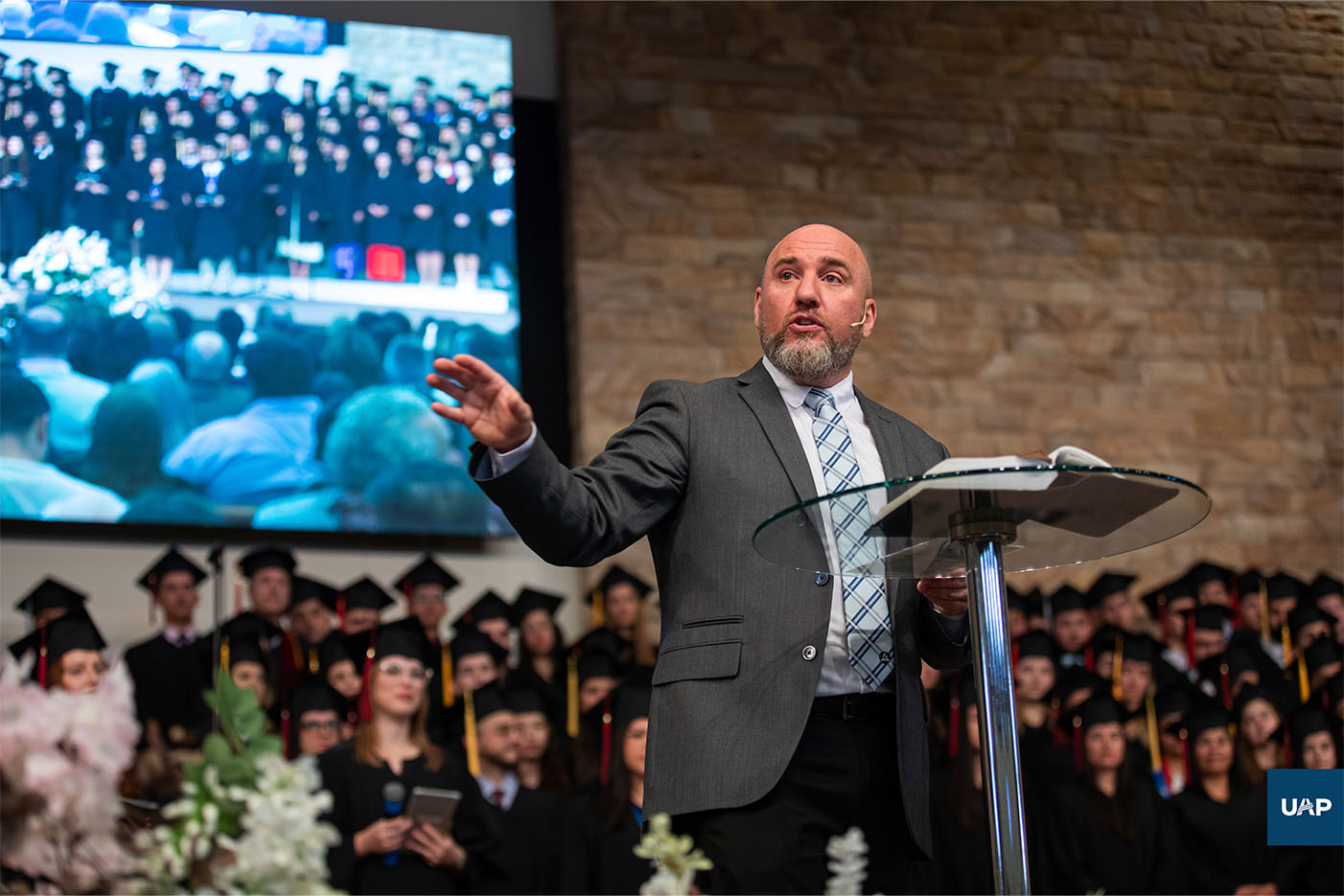 El mensaje de esta mañana estuvo dirigido por el Pr. Óscar López, presidente de la Unión Adventista Española y padre de graduando de la Facultad de Ciencias Económicas y de la Administración.