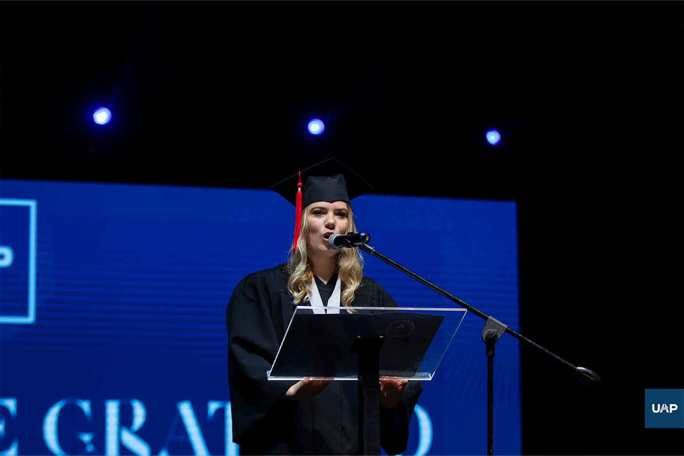En representación de los graduados, la licenciada en Administración Aldana Ayelén Kimel, ofreció un discurso cargado de emoción y agradecimiento. Con palabras profundas recordó el pasaje bíblico de 1 Samuel 7:12: «Hasta aquí nos ayudó el Señor», y animó a sus compañeros a avanzar con confianza, sabiendo que no están solos.
