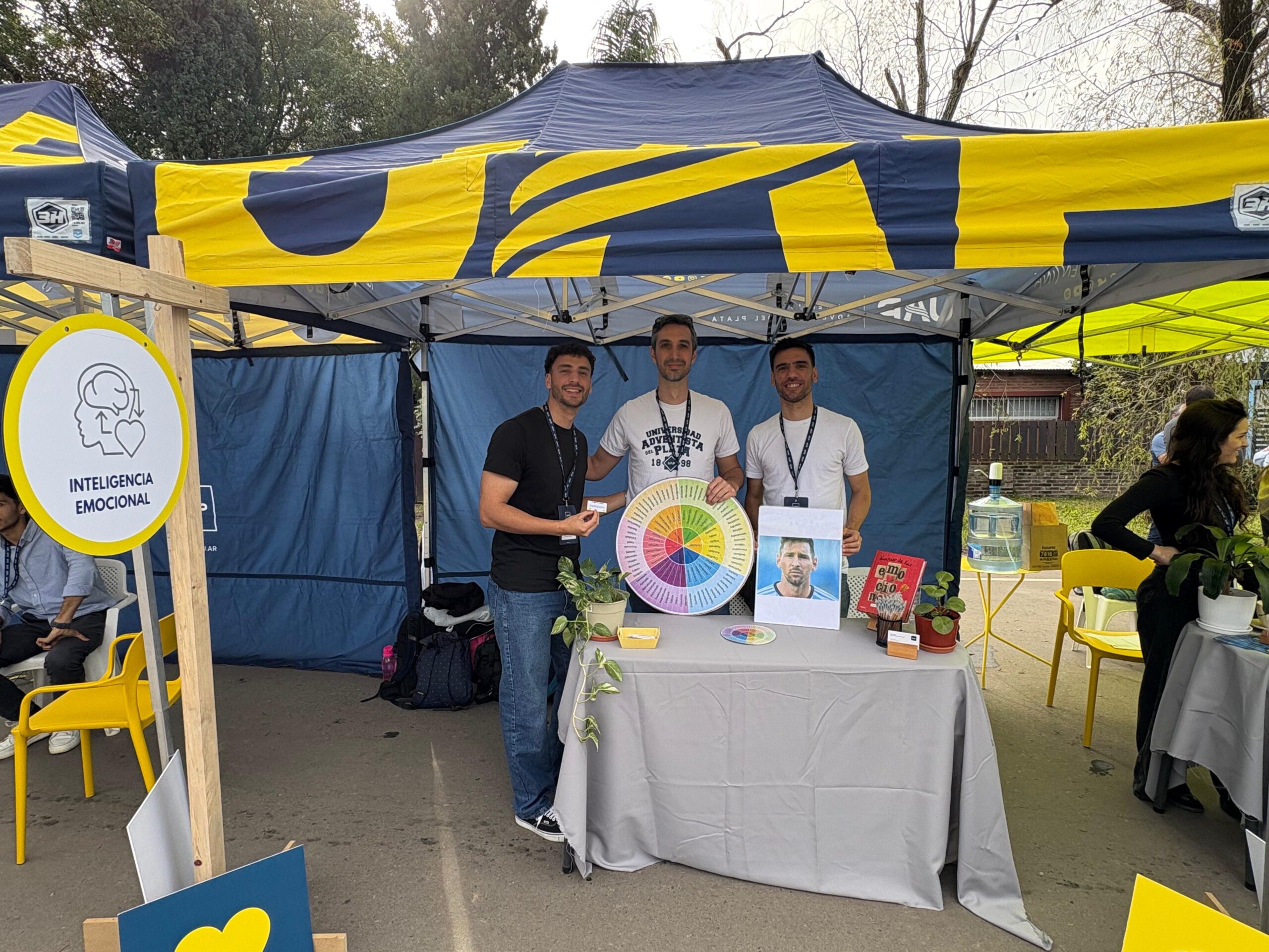 Los psicólogos Sebastián Jalifi, Mariano Ramos y Mauro Yáñez presentando el stand de Inteligencia personal.